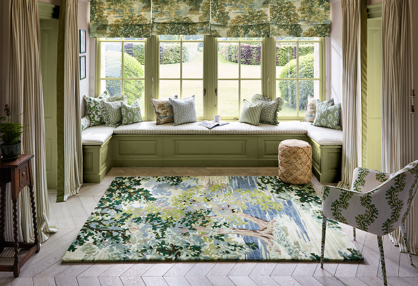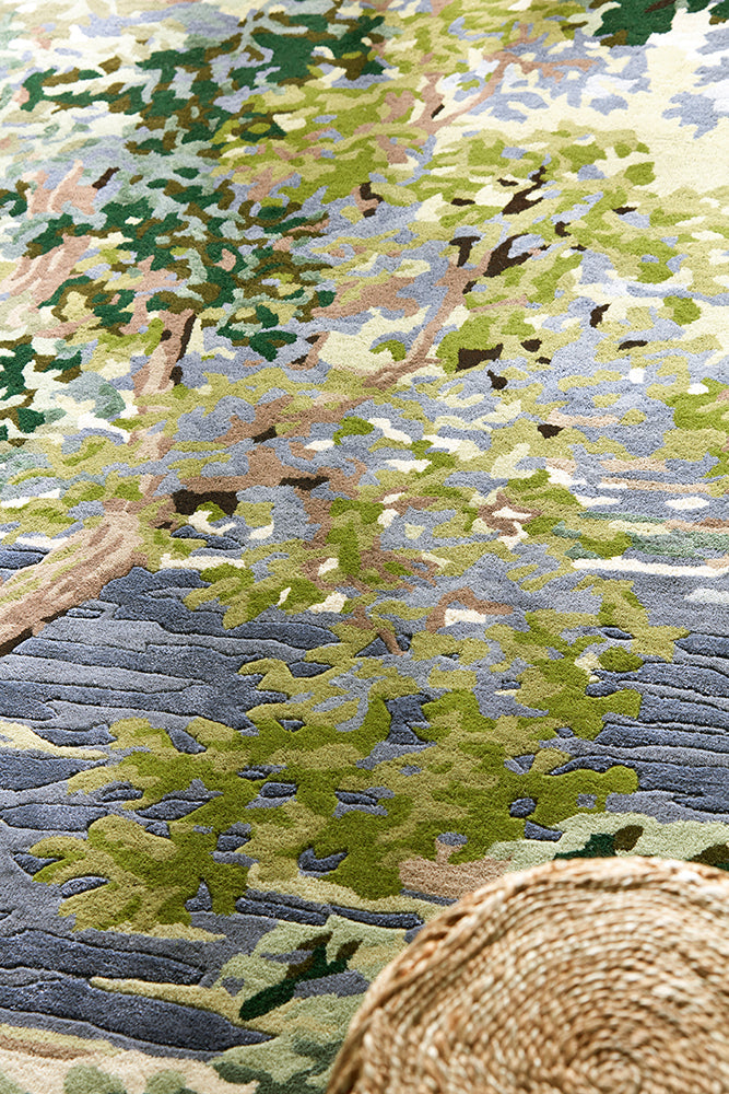 This impressionist scene of ancient trees and arched, bowing branches, creates a dense canopy that draws the eye towards a secluded glade. Offering a beautiful feeling of perspective and depth, age old woodlands represent longevity, life, growth, and strength. A luscious countryside scene come to life in a deep sumptuous, handtufted rug in fawn and olive green.