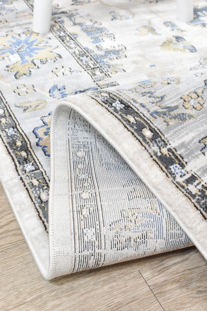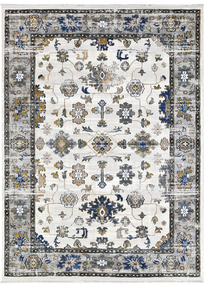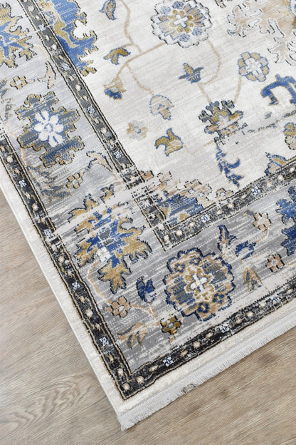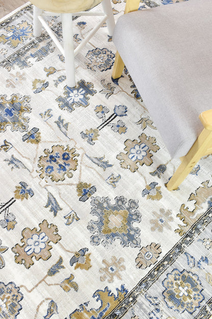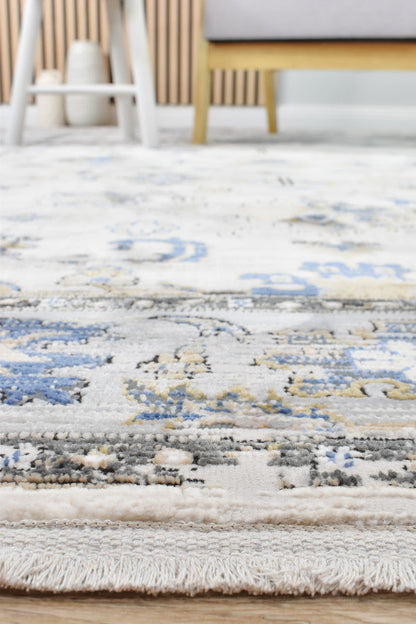 The Eternal rug features a beautifully distressed design crafted from soft polyester and made in Turkey. Its color palette of blues, greys, and light mustard blends seamlessly to create a subtle yet elegant traditional look. Designed to complement a space rather than overpower it, this versatile rug is perfect for all indoor areas, offering both style and practicality.
