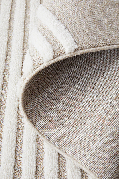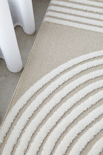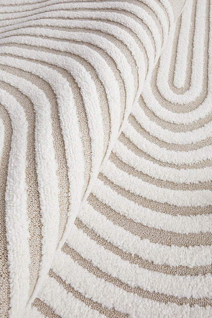 The Lotus Abbey rug presents a modern masterpiece, where design and function converge to create a visually stunning statement. Featuring curved arches articulated through precise high and low pile details, this rug infuses any room with a touch of sophistication. Its subtle interplay of texture enhances the rug's elegant lines, making it a perfect complement to neutral, modern, or contemporary decor. Available in beige, white, and a harmonious mix of both, the Lotus Abbey rug offers versatility and style, becoming a focal point that gracefully anchors any interior space.